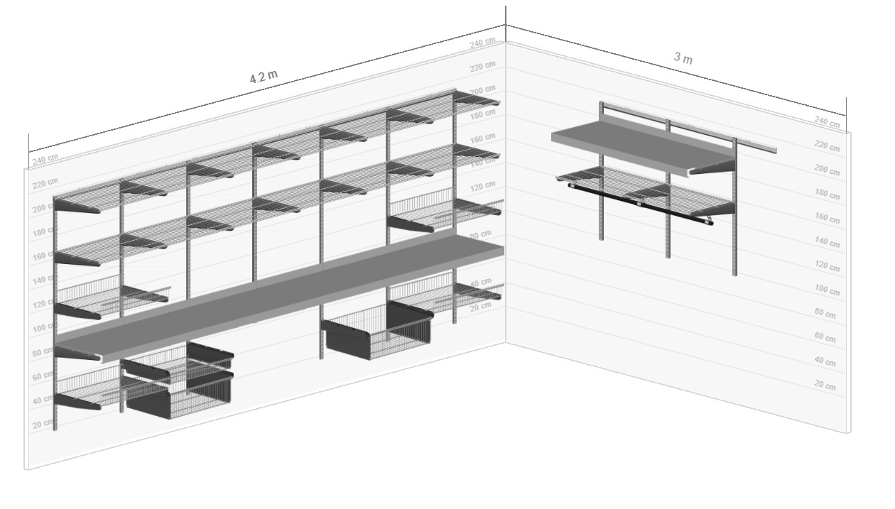 Базовый комплект гардеробной системы GS - это готовое решение для квартиры, дачи, гаража, обеспечивающее удобное хранение вещей. Система собирается в 6 разных конфигурациях, что позволяет подстраивать ее под размеры помещения и ориентироваться на личные пожелания по расположению отдельных элементов. В комплект входят несущие рельсы и навесные направляющие, полки, штанги, аксессуары, крепежные элементы. Можно докупить множество дополнительных компонентов для гардеробной системы.