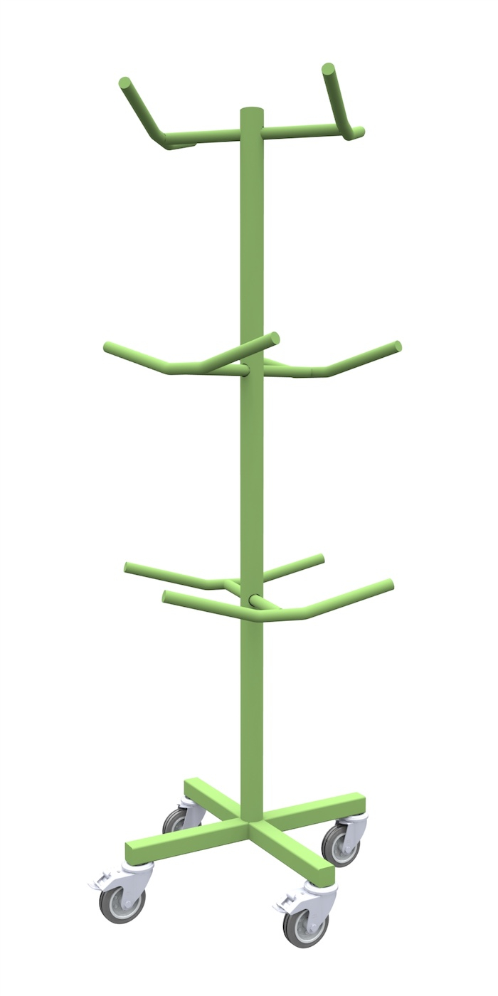На стеллаж установлены 4 поворотных колеса с тормозом.