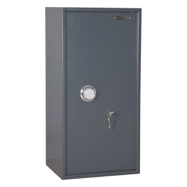 Сейф двухсекционный, оснащен двумя съемными полками и Трейзером. В двери установлен ключевой 8-ми сувальдный замок с ригельной системой запирания. Диаметр ригеля 20 мм.